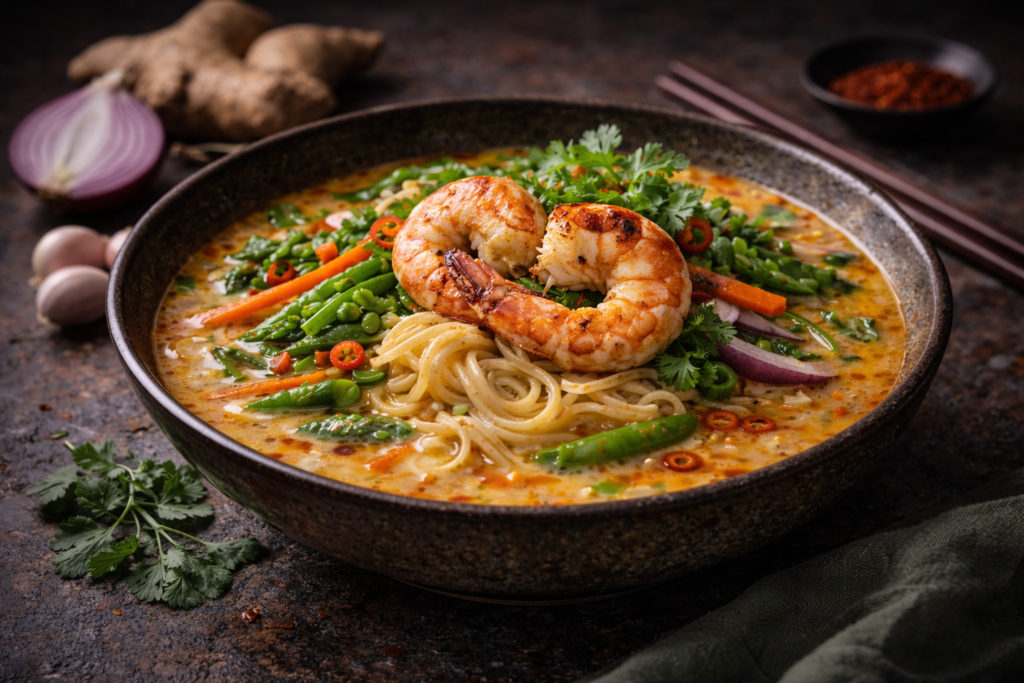 Unsere Thai-Suppe mit Gambas ist definitiv ein Highlight in unserer Küche, das wir regelmäßig zubereiten. Diese Suppe zeichnet sich durch ihre Frische und Knackigkeit aus, dank der Zugabe von Zuckerschoten, Karotten und Lauchzwiebeln. Sie ist einfach zuzubereiten und steht in nur 20 Minuten auf dem Tisch. Die rote Currypaste und der Chili verleihen der Suppe eine angenehme Schärfe.