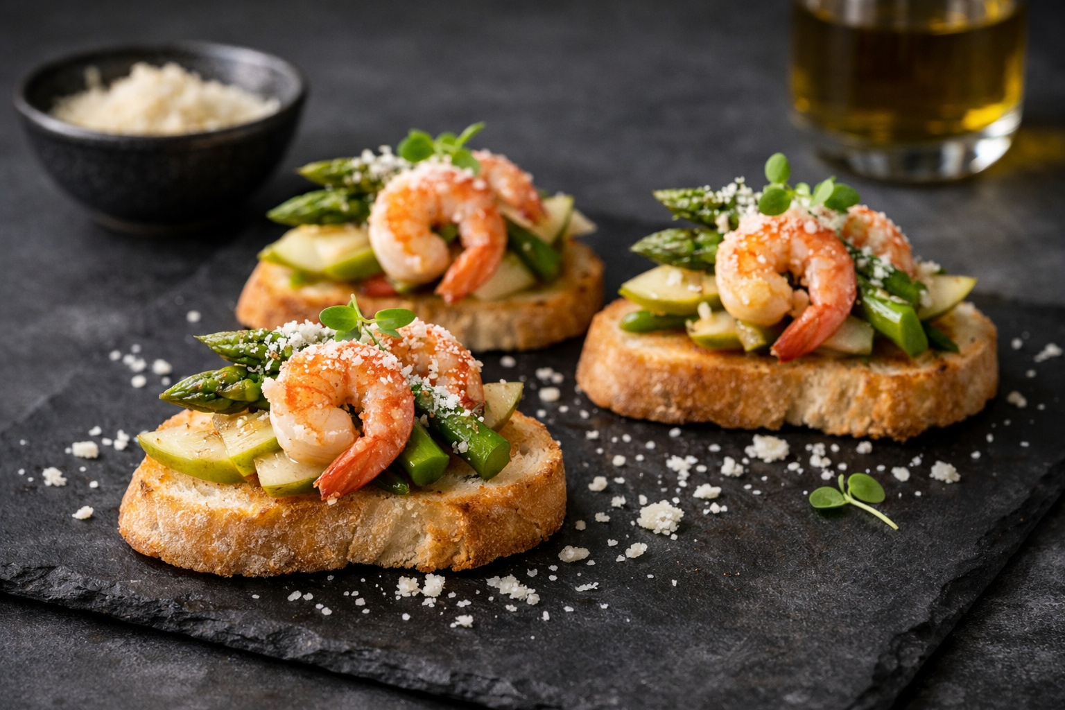 Diese kleinen Ciabatta-Kreationen verbinden schlichte Zutaten mit feiner Raffinesse: knusprig geröstete Mini-Ciabatta-Scheiben bilden die Grundlage für saftige Garnelen, zarten grünen Spargel und süß-aromatische Birnenscheiben. Zart gehobelter Käse dazu, vollenden das Zusammenspiel der Aromen und schaffen eine harmonische Balance zwischen herzhaft und fruchtig.