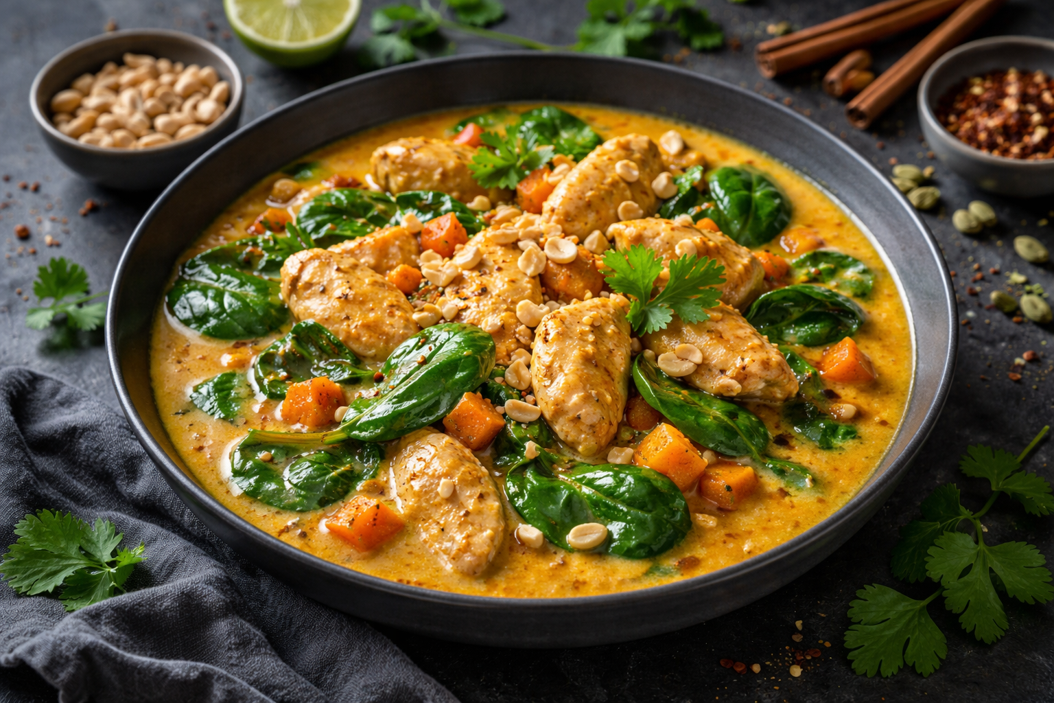 Manchmal sind es die einfachsten Kombinationen, die am meisten beeindrucken – wie zartes Hähnchen, frischer Babyspinat und eine cremige Sauce, die alle Sinne umhüllt. Das Hähnchen brutzelt goldbraun, während der Duft von Kokos und einem Hauch Sherry die Küche erfüllt. Kurz gedünsteter Babyspinat bringt frische, leuchtende Noten ins Spiel, und knackige Erdnüsse verleihen jedem Bissen einen überraschenden Crunch. Serviert wird dazu ein duftender, lockerer Reis, der die Aromen perfekt aufnimmt und das Gericht harmonisch abrundet. Jede Gabel vereint Cremigkeit, Frische und Biss zu einem Geschmackserlebnis, das sofort Lust auf den ersten Bissen macht.