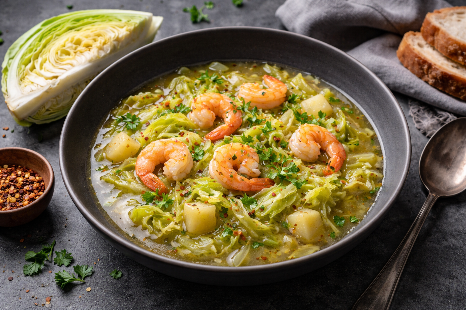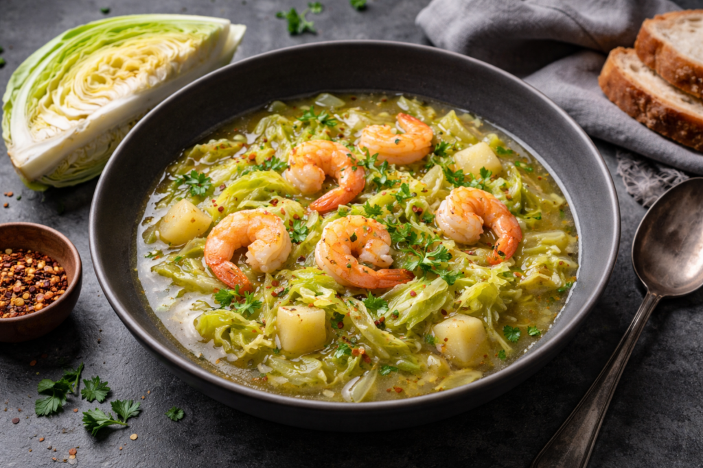Wenn die Tage kürzer und die Abende kühler werden, wärmt unsere köstliche Suppe Körper und Seele: Unsere Spitzkohlsuppe mit Gambas verbindet zarten Spitzkohl mit cremiger Kokosmilch zu einem samtigen, wohltuenden Geschmackserlebnis. Ein Löffel Tahin sorgt für eine dezente nussige Note, während eine Prise Zimt die Aromen sanft abrundet und der Suppe winterliche Wärme verleiht.