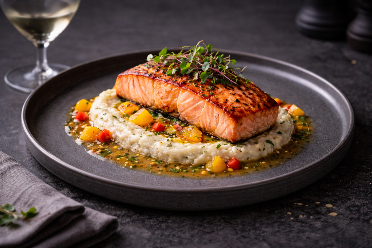Knusprig auf der Hautseite gebratener Lachs trifft auf ein samtiges Kartoffel-Selleriepüree, dessen feine, erdige Aromen eine elegante Grundlage bilden. Kleine Würfel bunter Paprika setzen lebendige Farbakzente und bringen eine frische, leichte Süße ins Spiel.