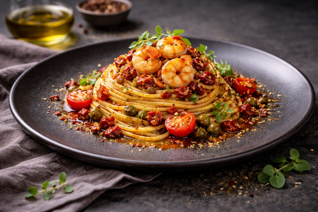 Die Tomatensauce bringt eine natürliche Fruchtigkeit mit, die durch frischen Oregano eine duftige Leichtigkeit erhält. Kleine Stücke getrockneter Tomaten sorgen für Tiefe, Kapern setzen feine, salzige Akzente und eine Prise Chili verleiht dem Ganzen eine angenehme, sanfte Schärfe. Die Garnelen runden das Gericht mit ihrer zarten Textur und einer dezenten Meeresnote ab.