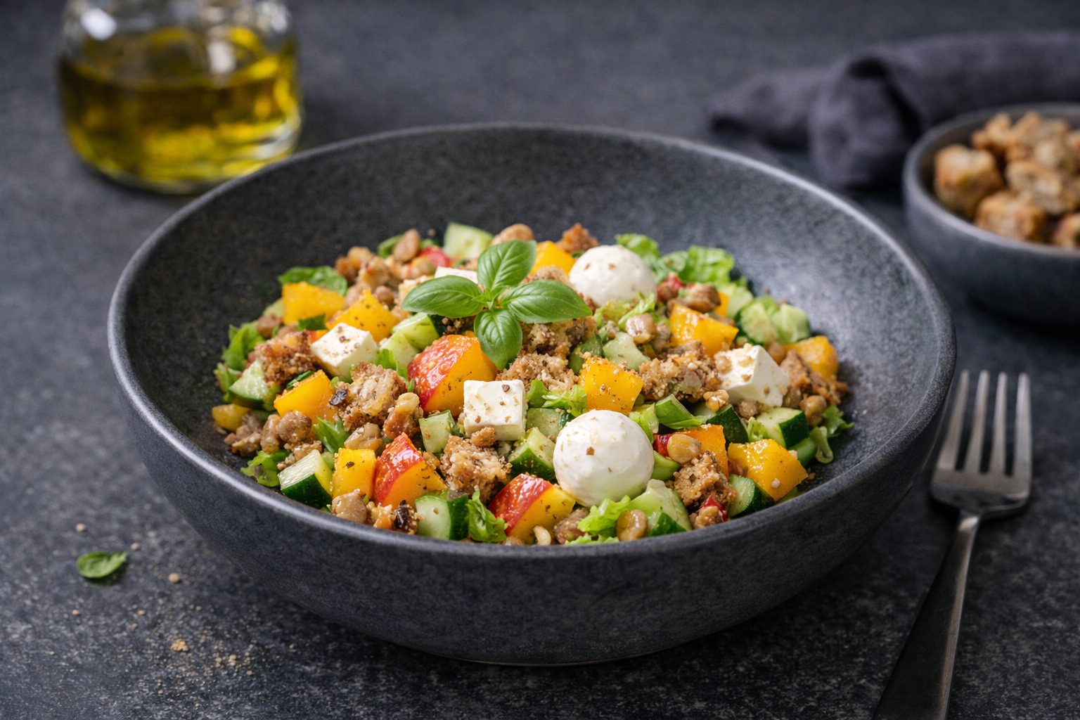 Ein köstlicher Sommersalat, der mediterrane Leichtigkeit und fruchtige Frische vereint: Unser Panzanella-Brotsalat begeistert mit saftigen Pfirsichen, knackiger gelber Paprika, cremigem Feta und zarten Mini-Mozzarella-Kugeln.