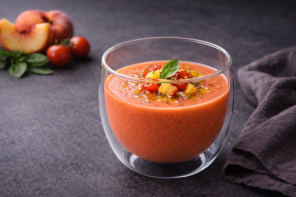 Genießen Sie den Geschmack des Sommers – Löffel für Löffel. Unsere fruchtig-frische Pfirsich-Tomaten-Gazpacho vereint aromatische, sonnengereifte Tomaten mit der natürlichen Süße reifer Pfirsiche zu einer überraschend feinen, perfekt ausbalancierten Komposition.
