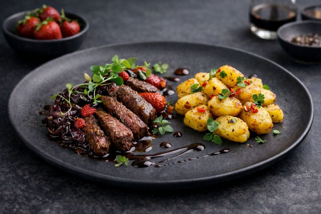 Zarte Rinderfiletstreifen werden schonend gebraten und entfalten ein saftiges, klares Aroma. Fein karamellisierte Erdbeeren setzen mit ihrer dezenten Süße einen fruchtigen Akzent, während sanft geschmorte rote Zwiebeln, veredelt mit kräftigem, braunem Balsamico, für eine harmonische Balance aus Süße und Säure sorgen.