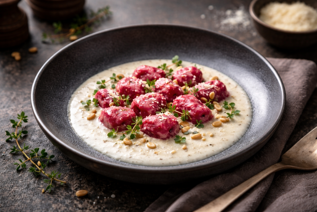 Rote Bete Gnocchi in samtiger Parmesansauce