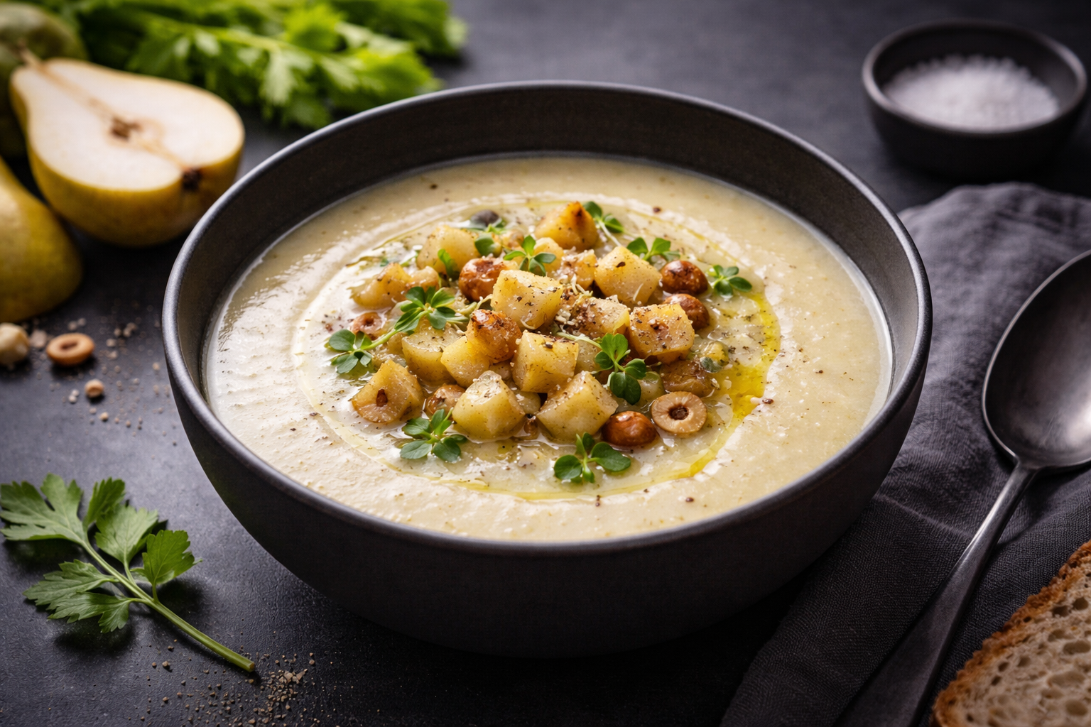 Eine Suppe, die auf der Zunge zergeht: Die cremige Erdigkeit des Selleries verbindet sich mit der süßen Frische der Birnen zu einem harmonischen Geschmackserlebnis. Kleine Überraschungen wie zarte Birnenwürfel und knackige Haselnüsse setzen feine Akzente – ein Gericht, das Genuss, Frische und Leichtigkeit in jedem Löffel vereint.