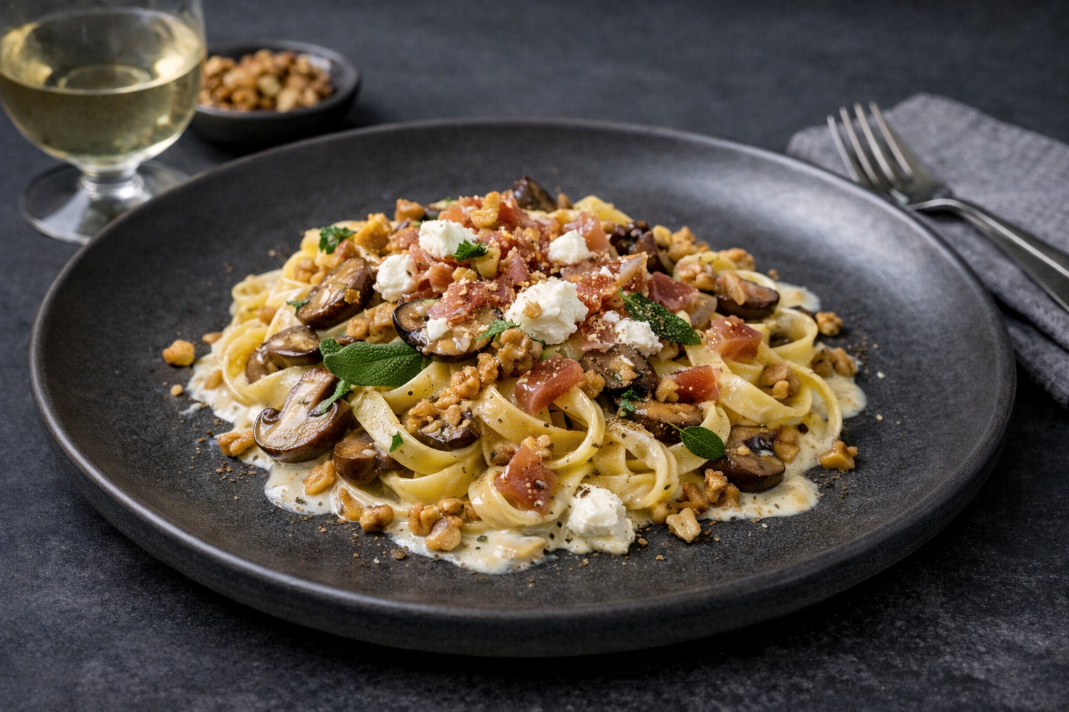 Zarte Tagliatelle schmiegen sich an eine cremige Weißwein-Sahne-Sauce, in der sautierte Pilze und feine Schalotten für Tiefe und wohlige Wärme sorgen. Knusprig gehackte Walnüsse setzen einen eleganten, nussigen Akzent, während frischer Salbei dem Gericht eine subtile, würzige Note verleiht. Sanft untergehobene Burrata schmilzt leicht in der Pasta und vollendet das Ensemble mit feiner Cremigkeit.