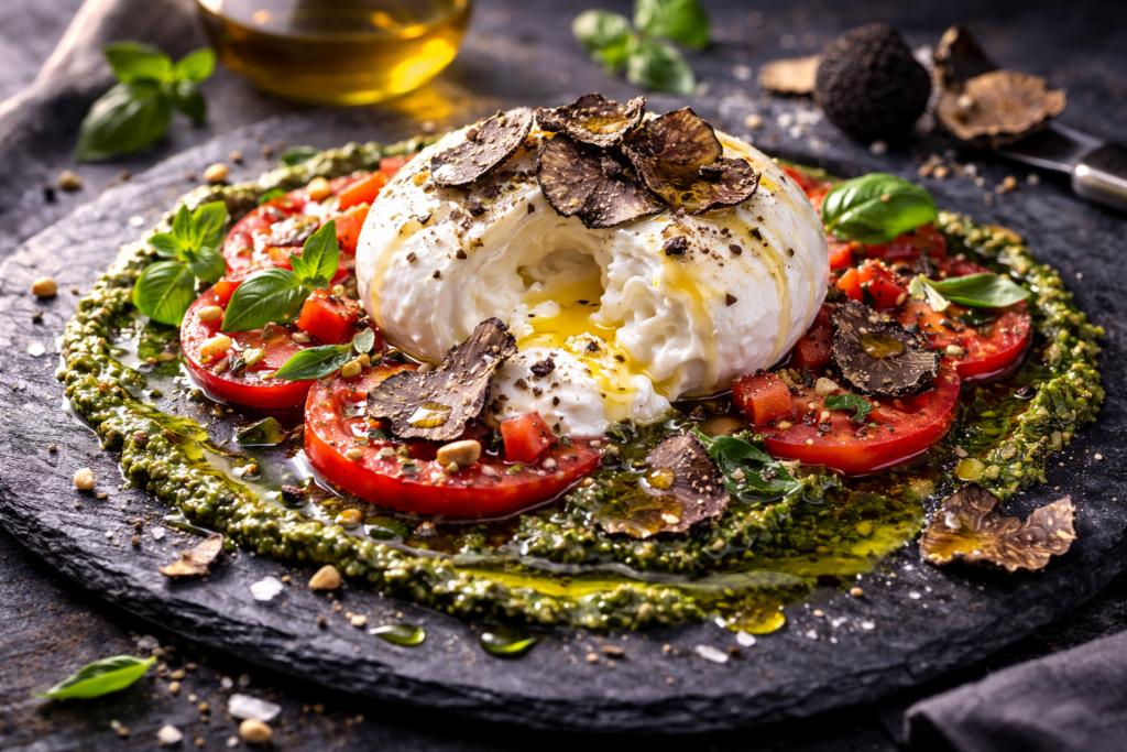 Manchmal braucht es nur wenige, dafür außergewöhnlich gute Zutaten, um ein echtes Gourmet-Erlebnis zu schaffen. Cremige Burrata, aromatische Ochsenherztomaten, hauchdünne Trüffelscheiben und ein intensives Basilikum-Pesto verbinden sich hier zu einer eleganten Vorspeise, die mediterranen Genuss auf den Punkt bringt.