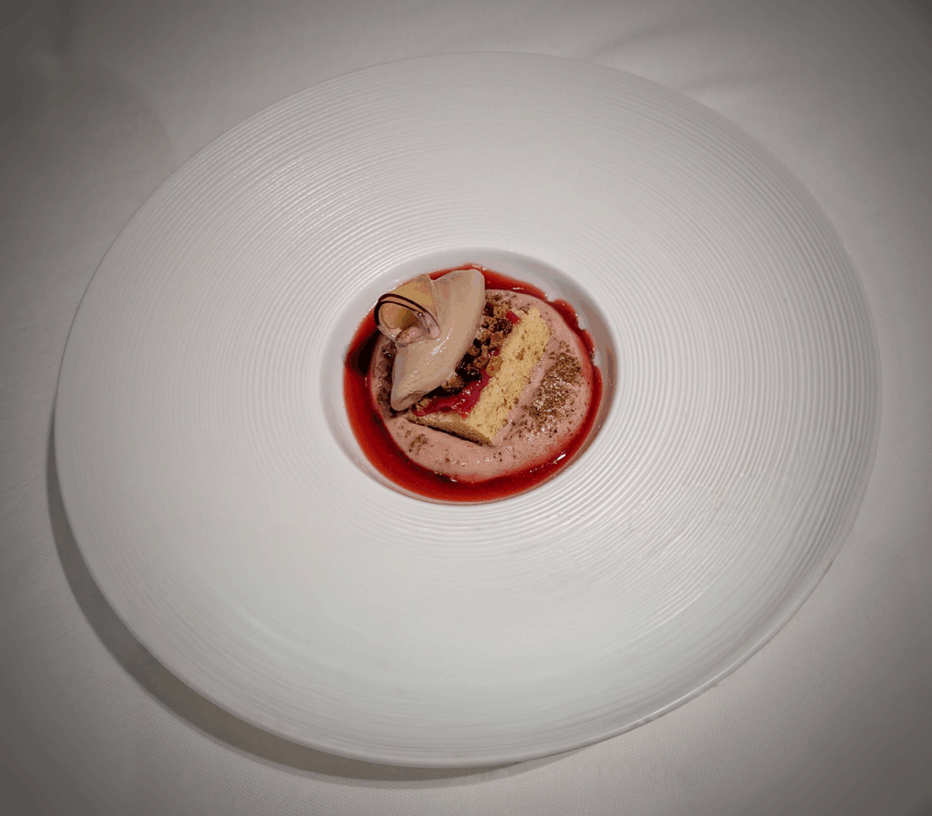 Rührkuchen / Steinpilzeis / Umeboshi Pflaume – André Siebertz entführt in eine raffinierte Welt der Dessert-Aromen, in der überraschende Kombinationen wie Rührkuchen mit Steinpilzeis und Umeboshi-Pflaume zu einem harmonischen Spiel aus Salz, Süße und würzigen Nuancen verschmelzen.