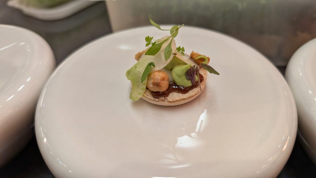 Macaron / Sellerie / Haselnuss / Liebstöckel – Feiner Macaron trifft auf die erdige Frische von Sellerie, nussige Haselnussnoten und das aromatische, kräuterige Flair von Liebstöckel – ein überraschend harmonisches Geschmackserlebnis.