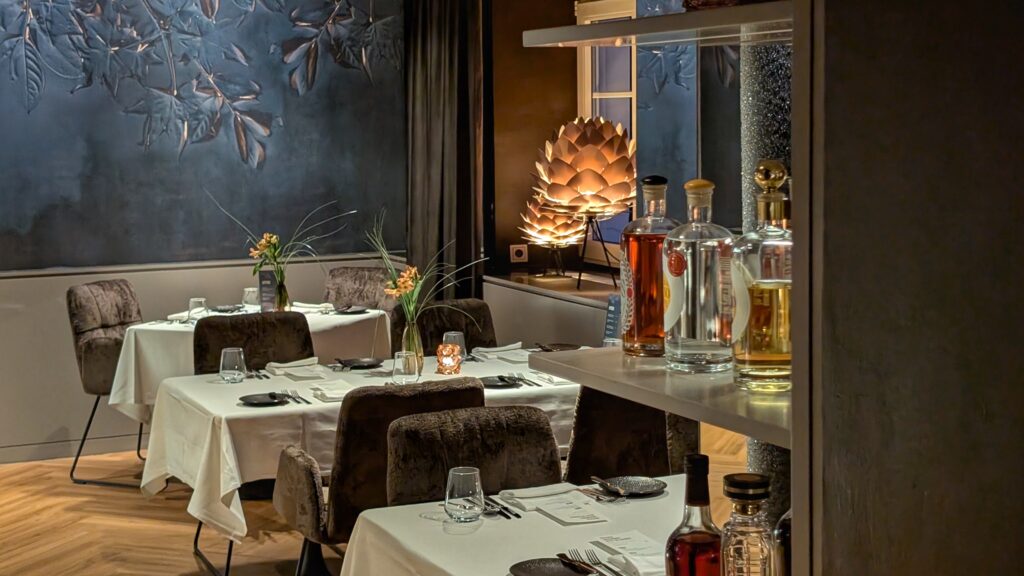Schon beim Betreten spürt man: Hier verbindet sich gehobene Eleganz mit einer warmen, intimen Wohlfühlatmosphäre. Dunkelgrüne Blütentapeten und edler Parkettboden schaffen ein stilvolles, zugleich einladendes Ambiente. Sanftes Licht fällt auf perfekt gedeckte Tische, die mit weißen Tischdecken und warmen, braunen Stühlen harmonisch ergänzt werden. Designer-Lampen in Artischockenform setzen verspielte Akzente und unterstreichen die Liebe zum Detail.