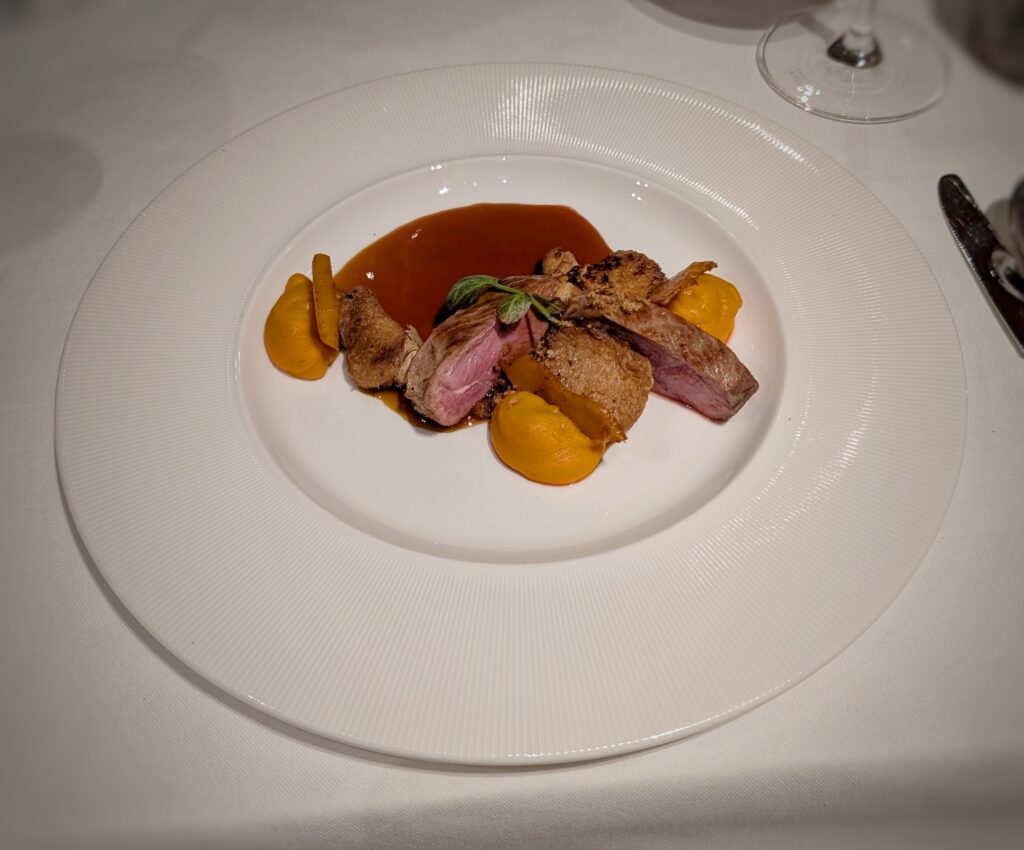 Ente / Kürbis / Mispel / Pom Pom Blanc – Zart rosa gebratene Entenbrust vereint sich mit samtigem Kürbispüree, süßer Mispel und feinem Pom Pom Blanc-Jus zu einem harmonischen Herbstarrangement.