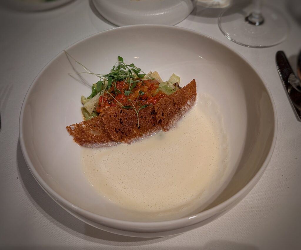 Spitzkohl / Avocado / Fenchel / Paprika / Röstbrot – Präzise geschnittene Miniwürfel aus Avocado, Fenchel und Paprika treffen auf knuspriges Röstbrot, während Spitzkohl, mildes Olivenöl und ein Hauch Pepperoni einen raffinierten, lebendigen Geschmackstanz erzeugen.