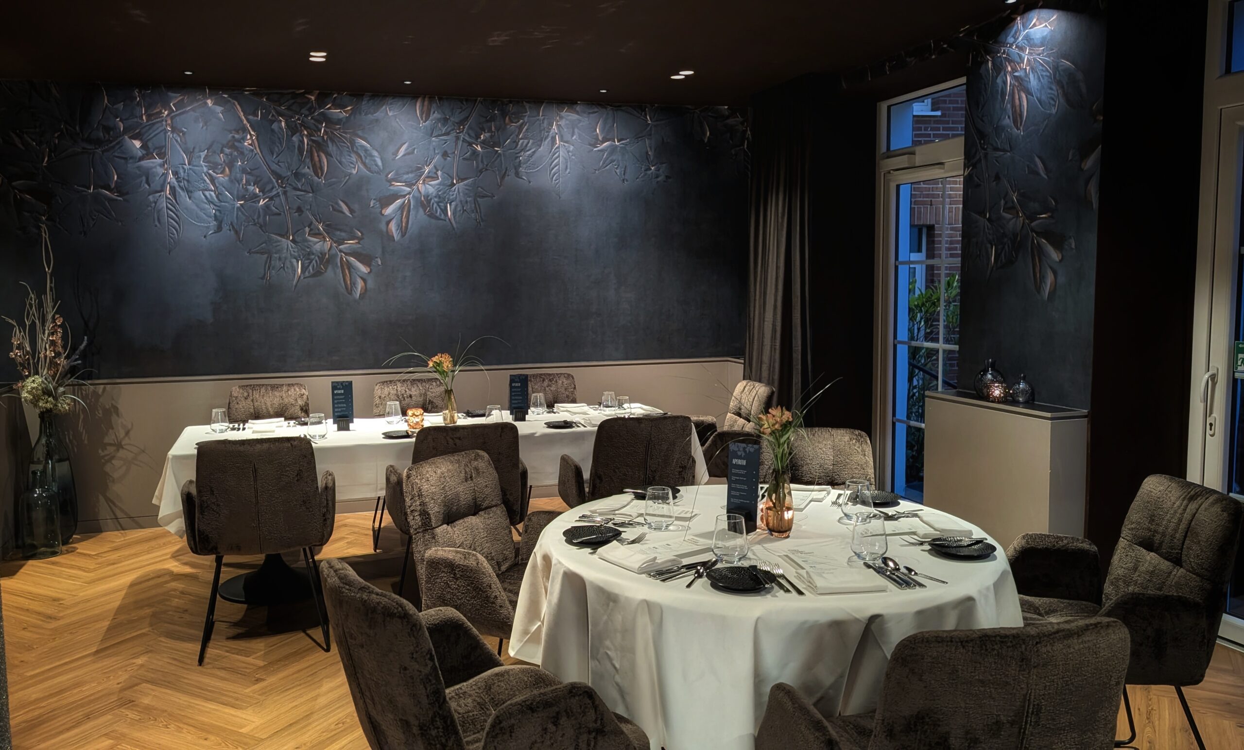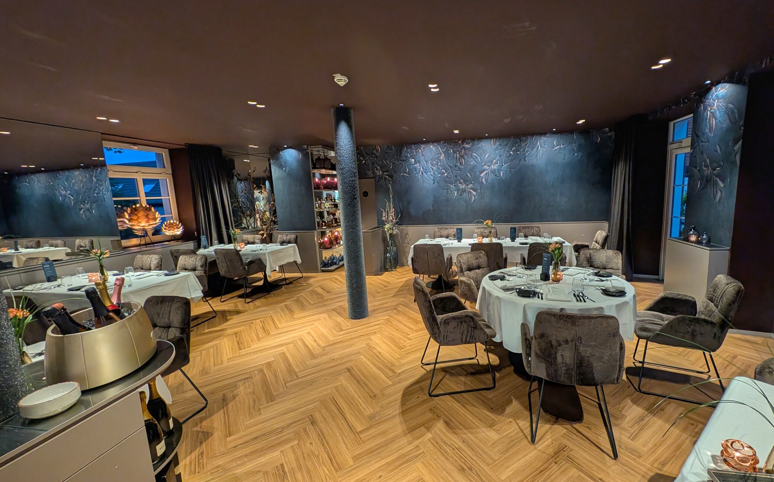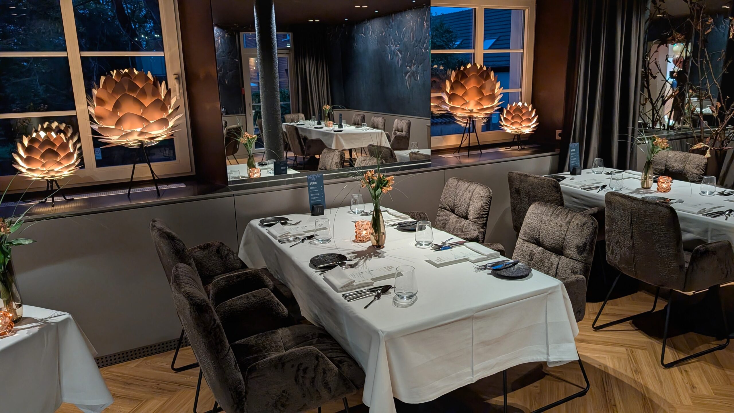 Schon beim Betreten spürt man: Hier verbindet sich gehobene Eleganz mit einer warmen, intimen Wohlfühlatmosphäre. Dunkelgrüne Blütentapeten und edler Parkettboden schaffen ein stilvolles, zugleich einladendes Ambiente. Sanftes Licht fällt auf perfekt gedeckte Tische, die mit weißen Tischdecken und warmen, braunen Stühlen harmonisch ergänzt werden. Designer-Lampen in Artischockenform setzen verspielte Akzente und unterstreichen die Liebe zum Detail.
