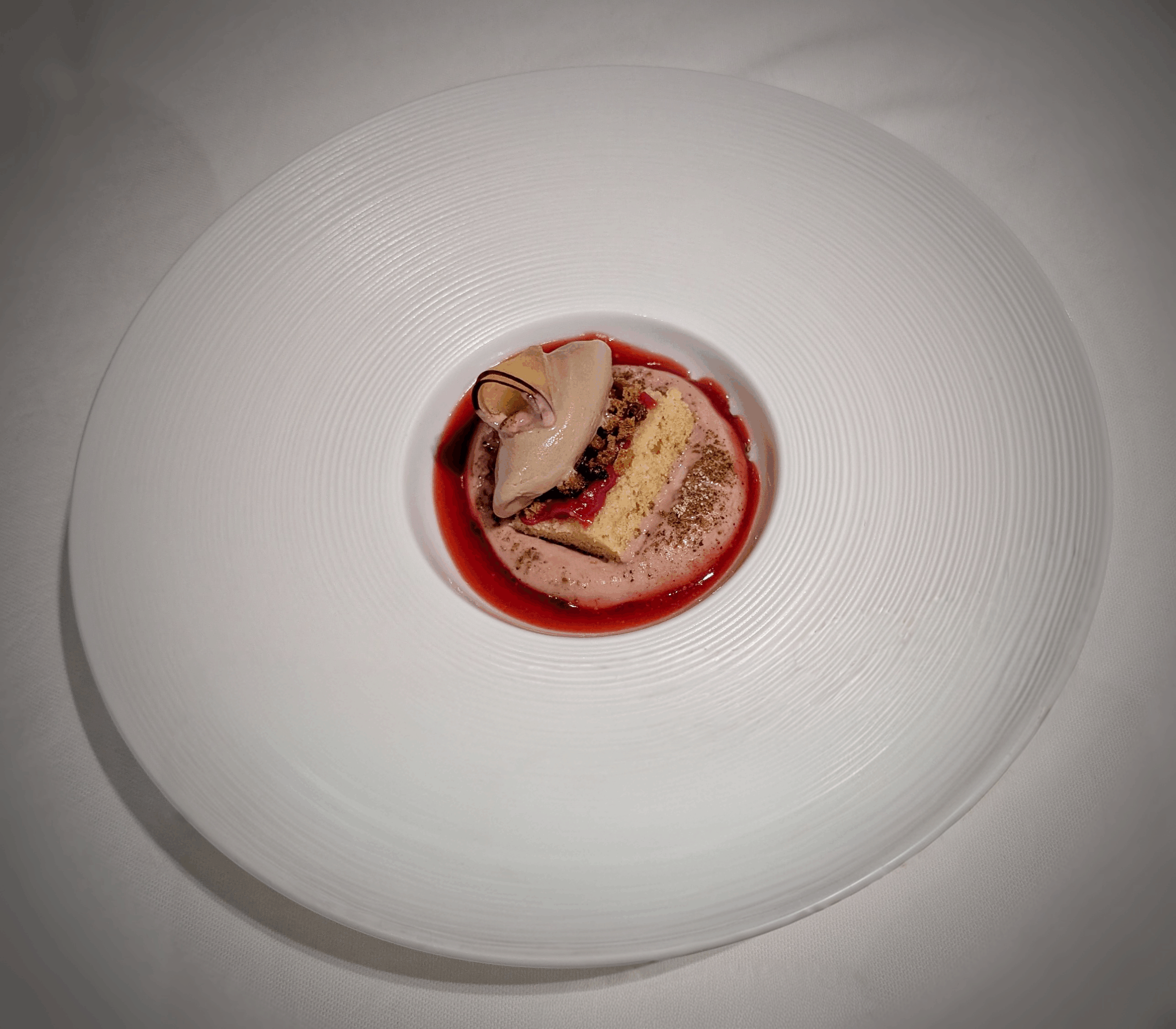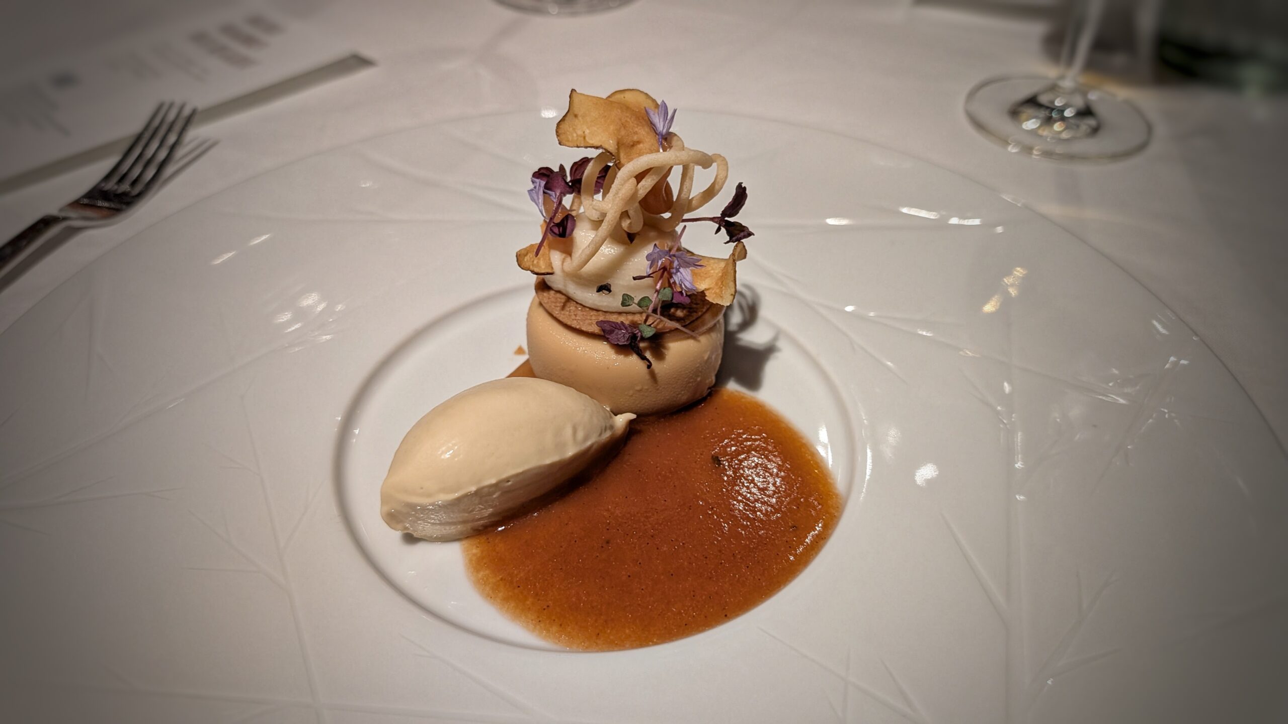 Rührkuchen / Steinpilzeis / Umeboshi Pflaume – André Siebertz entführt in eine raffinierte Welt der Dessert-Aromen, in der überraschende Kombinationen wie Rührkuchen mit Steinpilzeis und Umeboshi-Pflaume zu einem harmonischen Spiel aus Salz, Süße und würzigen Nuancen verschmelzen.