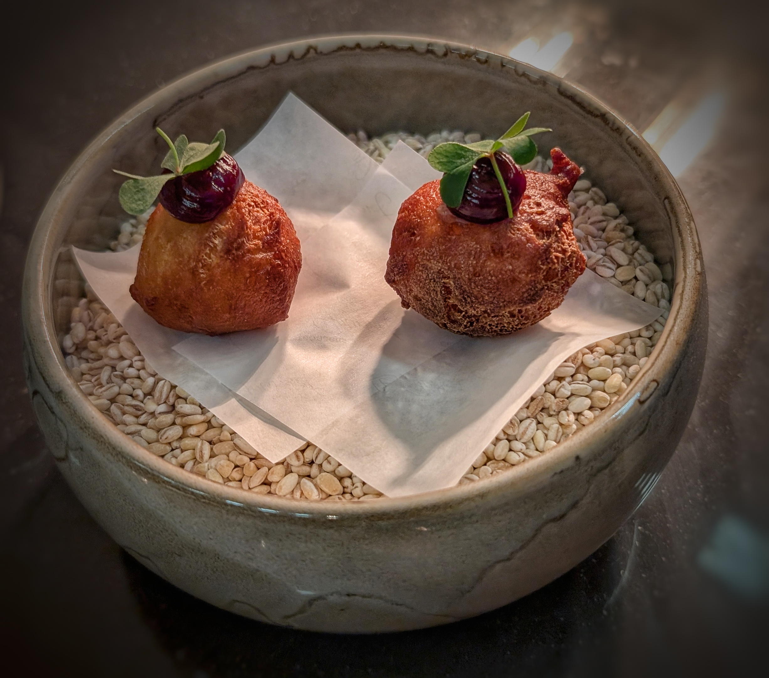 Krapfen / Taleggio / Kirsche / grüner Pfeffer – Knuspriger Krapfen mit cremigem Taleggio, saftiger Kirsche und dem würzig-pikanten Kick fermentierten grünen Pfeffers – ein Snack, der auf ganzer Linie begeistert.